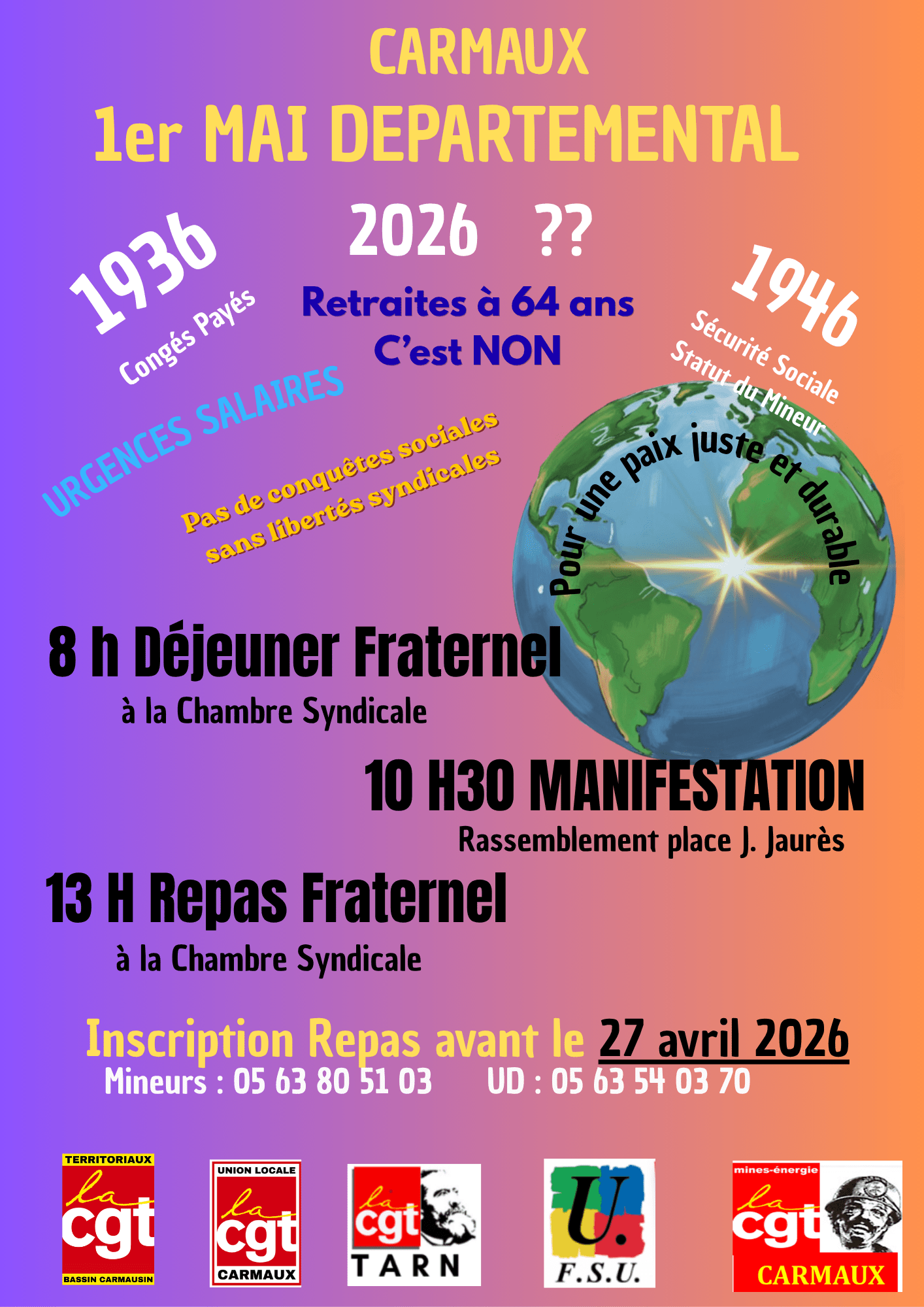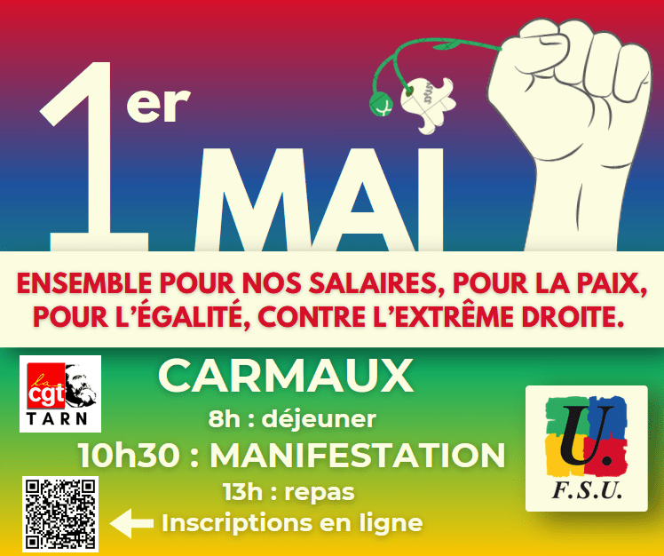 Ensemble pour nos salaires, pour la paix, pour l’égalité, contre l’extrême droite ! Manifestation unitaire (CGT, Confédération Paysanne, FSU, Solidaires). Déjeuner et repas co-organisés par la CGT et la FSU.