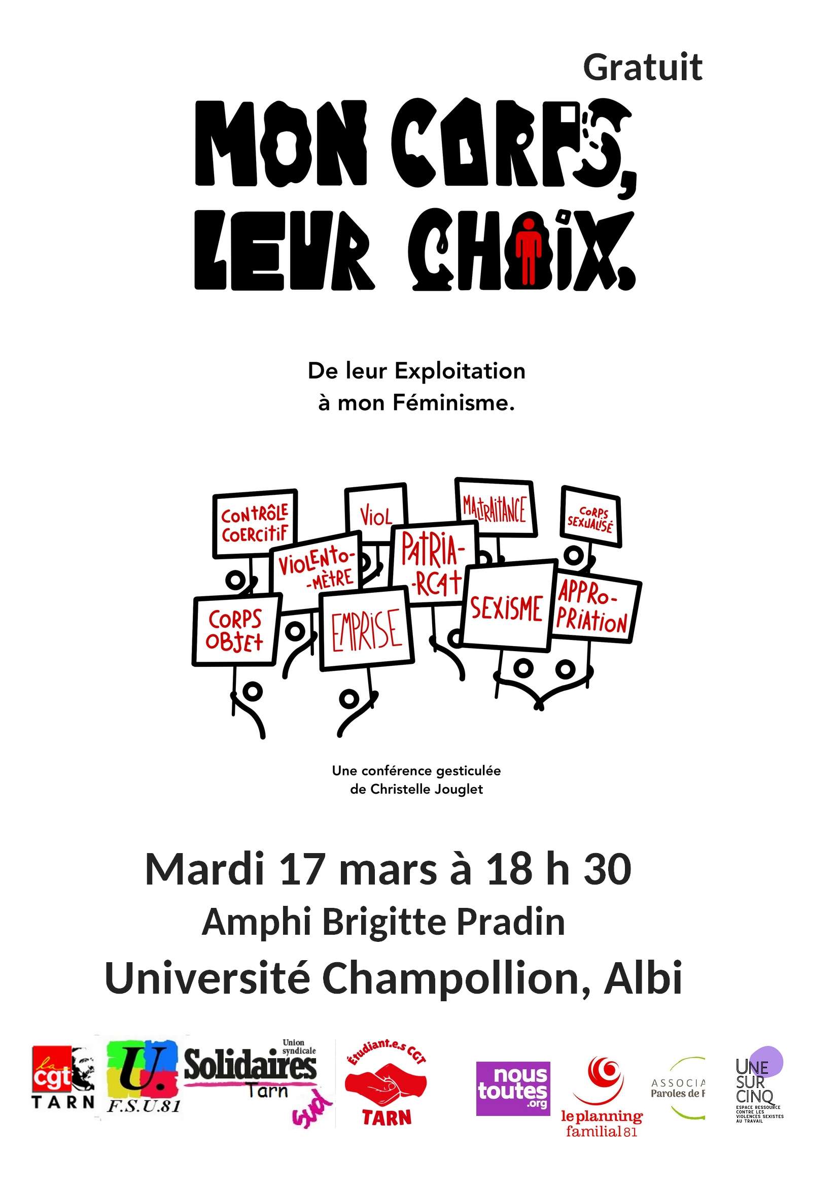 Conférence gesticulée mardi 17 mars, 18h30 à la fac d’Albi : Mon corps, leur choix. 2026-03-10T10:09:18+01:0010 mars 2026|Catégories : À LA UNE| Conférence gesticulée mardi 17 mars, 18h30 à la fac d’Albi : Mon corps, leur choix. Partagez cet article ! FacebookXWhatsAppTelegramEmail Articles similaires La FSU reste la première organisation représentative du Tarn ! La FSU reste la première organisation représentative du Tarn ! 13 décembre 2022 SPÉCIAL CONTRACTUEL-LES : ce qu’il faut savoir aujourd’hui pour agir et mieux vous défendre ! SPÉCIAL CONTRACTUEL-LES : ce qu’il faut savoir aujourd’hui pour agir et mieux vous défendre ! 23 novembre 2020 Conditions sanitaires et rentrée scolaire : c’est le flou artistique ! Conditions sanitaires et rentrée scolaire : c’est le flou artistique ! 1 septembre 2020 Le ministre de l’Éducation Nationale ne prend pas la mesure de cette rentrée hors norme Le ministre de l’Éducation Nationale ne prend pas la mesure de cette rentrée hors norme 26 août 2020 Premier ministre à Albi vendredi 14 juin : accueillons-le bruyamment 11h30, place du grand théâtre Premier ministre à Albi vendredi 14 juin : accueillons-le bruyamment 11h30, place du grand théâtre 11 juin 2019